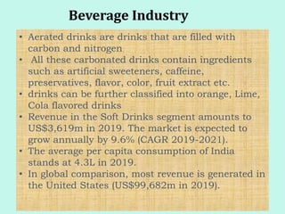 The document discusses the beverage industry's digital marketing strategies, highlighting the performance of various brands like Coca-Cola, Pepsi, and Sprite. It outlines their marketing campaigns, revenue growth projections, and audience engagement metrics across social media platforms. Overall, the industry is projected to experience significant growth, with Coca-Cola and Pepsi leading in social media presence and innovative campaigns.