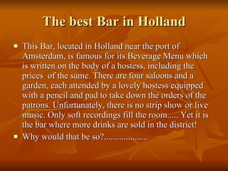 This document summarizes an unusual bar located in Holland near Amsterdam that is famous for having hostesses who wear the beverage menu written on their bodies. The bar has four saloons and a garden, each attended by a lovely hostess equipped with a pencil and pad to take drink orders. While there is no strip show or live music, it is reported that this bar sells more drinks in the district than others, perhaps due to its unique beverage menu display.