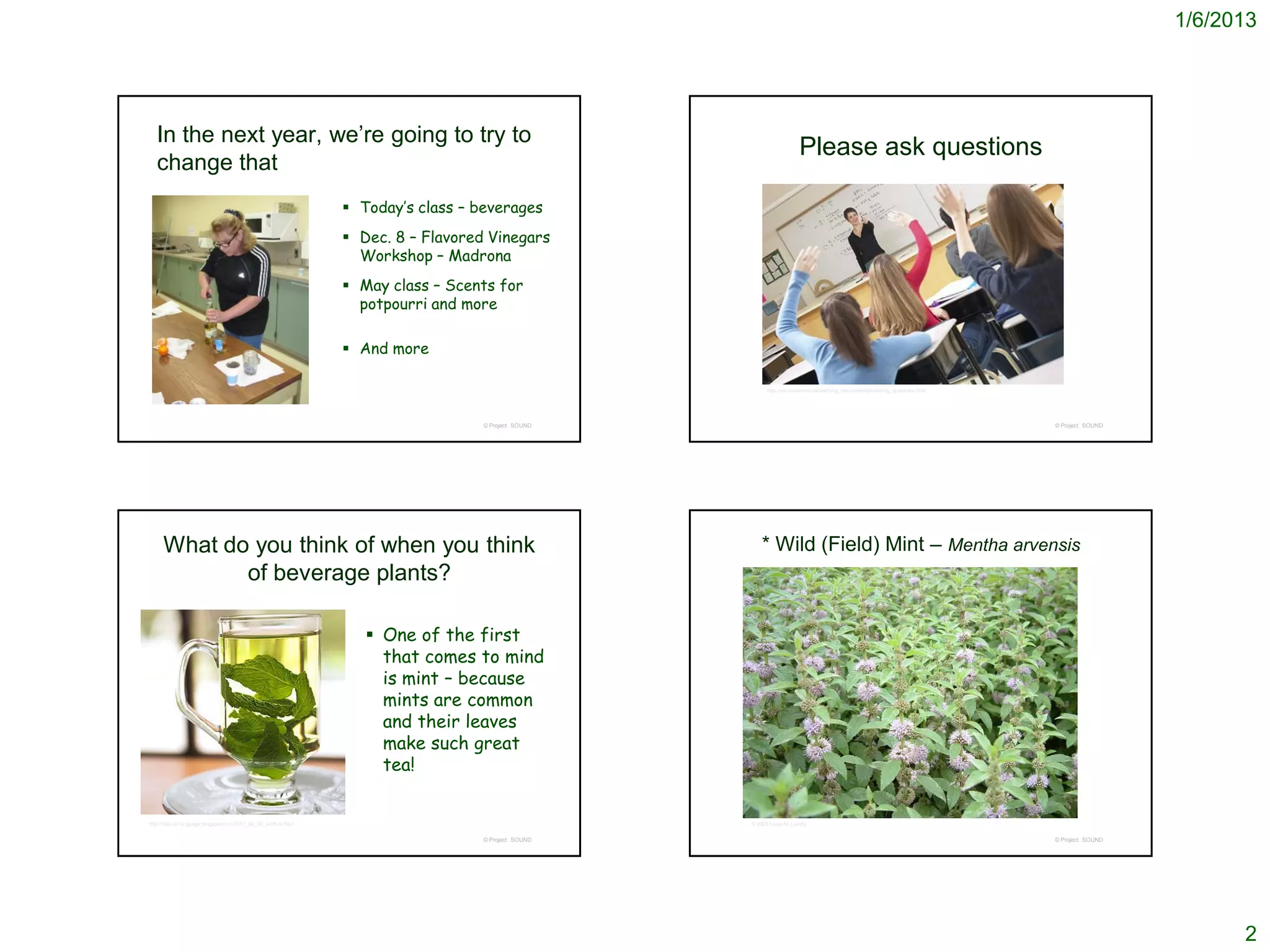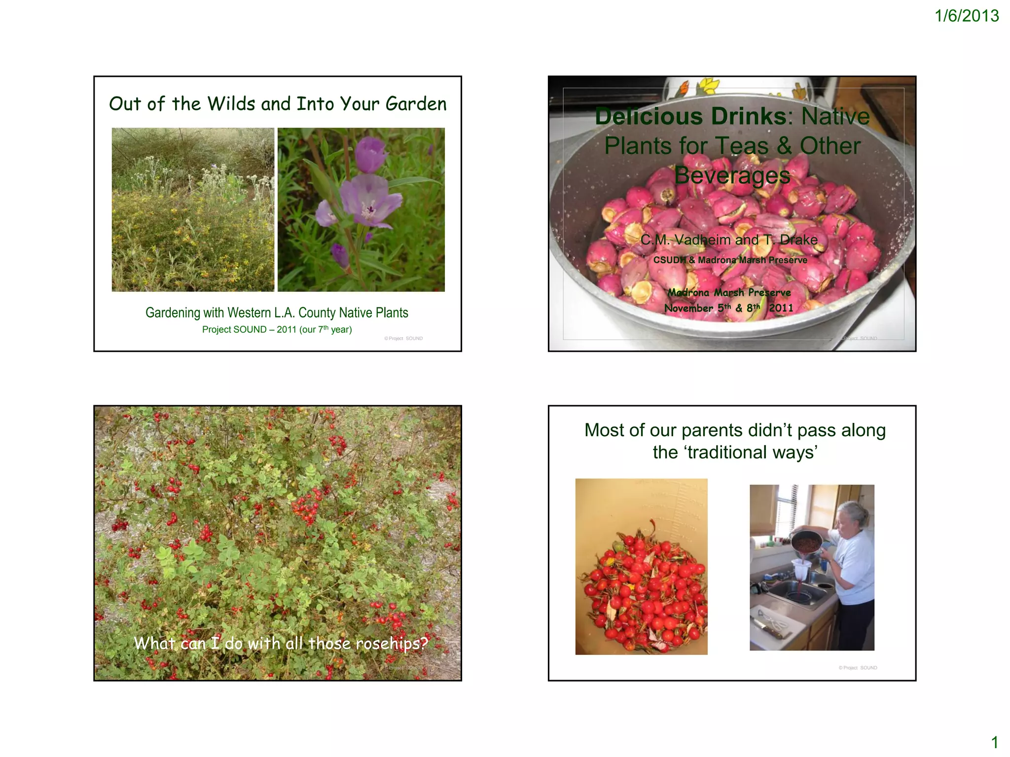 This document discusses using native plants for teas and beverages. It provides information on wild mint and its uses in tea and other drinks. Details are given on growing mint in gardens and harvesting it for drying or fresh use. Other plants mentioned that can be used for beverages include wild rose, pitcher sage, and hummingbird sage. The document discusses preparing and using dried leaves and other plant parts to make herbal teas and infusions. Medicinal properties and cultivation requirements are covered for some of the profiled plants.