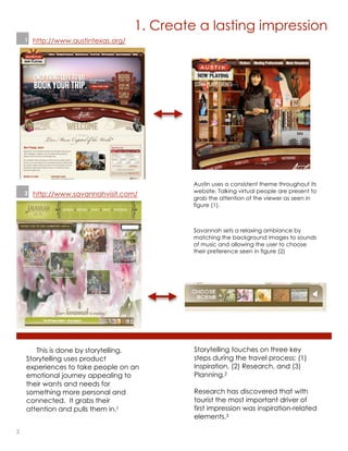 The document provides guidelines for optimizing tourism websites. It recommends creating a lasting first impression through storytelling and inspiration. Websites should help visitors imagine destinations through rich sensory content like pictures and videos. Graphics should be optimized to determine visitor interests and influence travel plans. The design must be user-friendly with easy navigation, event calendars, deals and offers to meet various visitor needs and capture attention. Analytics can measure which content is most popular to better target different visitor segments.