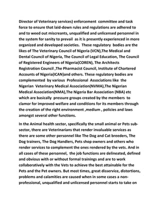 The article emphasizes the distinction between professional veterinarians and unqualified breeders or pet handlers who improperly provide medical care to animals. It highlights the responsibilities of regulatory bodies, such as the Veterinary Council of Nigeria, to uphold veterinary standards and combat malpractice, which has resulted in significant harm to pets and their owners. Pet owners are urged to avoid engaging with unlicensed individuals and to ensure they verify veterinary credentials to prevent potential dangers.
