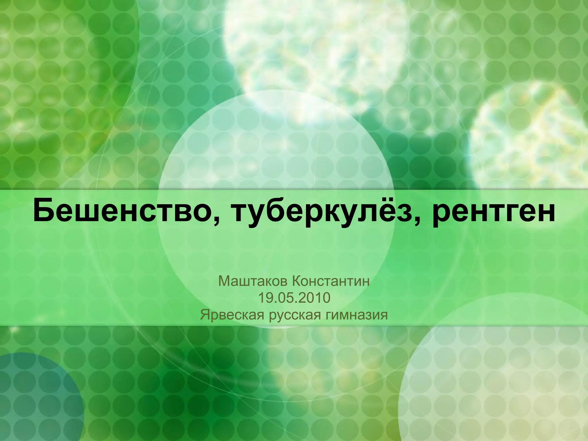 Документ описывает историю и последствия двух серьезных заболеваний: бешенства и туберкулеза. Бешенство, вызванное вирусом, вызывает тяжелые неврологические нарушения и зачастую приводит к смерти, тогда как туберкулез, обнаруженный Робертом Кохом, также приводит к серьезным симптомам и может длительное время оставаться бессимптомным. Также рассматривается изобретение рентгеновского аппарата, которое стало значительным достижением в медицине в 19 веке.