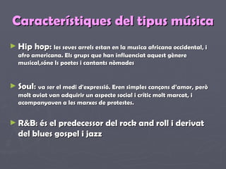 Característiques del tipusmúsica Hip hop: les seves arrels estan en la musica africana occidental, i afro americana. Els grups que han influenciat aquest gènere musical,sóne ls poetes i cantants nòmades Soul: va ser el medi d'expressió. Eren simples cançons d’amor, però molt aviat van adquirir un aspecte social i crític molt marcat, i acompanyaven a les marxes de protestes. R&B: és el predecessor del rock and roll i derivat del blues gospel i jazz