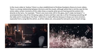 Beyonce's music video for "Jealous" effectively uses visuals that directly relate to the song's lyrics, like showing her throwing a glass when the lyrics mention breaking a glass. This draws out more emotion from the powerful song. Beyonce is also very skilled at acting and conveying realism and raw emotion in her videos, which engages audiences and makes the narratives feel realistic. Technical elements like lighting, camera angles, and sound design help set the mood and tone for understanding the video as a narrative piece.