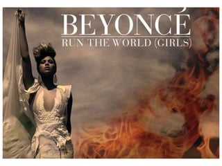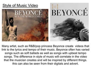 Beyonce creates different styles of music videos to match the tempo and lyrics of her songs. For her slow ballad "1+1", the video features intimate close-ups of Beyonce with minimal makeup to convey raw emotion. In contrast, her upbeat song "Run the World" has a fast-paced video with multiple outfit changes and locations to match the energy and message of female empowerment. Overall, Beyonce tailors her music videos to reflect the mood of each song through visuals, colors, and storytelling.