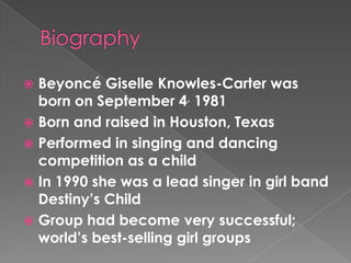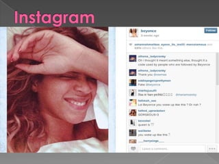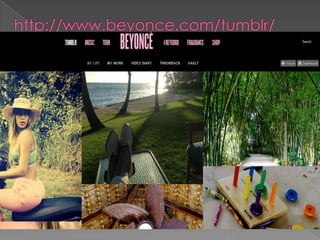 Beyoncé uses social media platforms like Facebook, Tumblr, and Instagram to connect with fans and build an online community around her music and career. She regularly posts about her music, tours, charity work, and personal life to give fans insights and encourage engagement through likes, comments, and participation in initiatives like her BeyGood charity. While she has a Twitter account, Beyoncé does not actively use it to interact with followers. Her strong online presence through consistent updates helps drive fans to interact with her virtual and real-world communities.