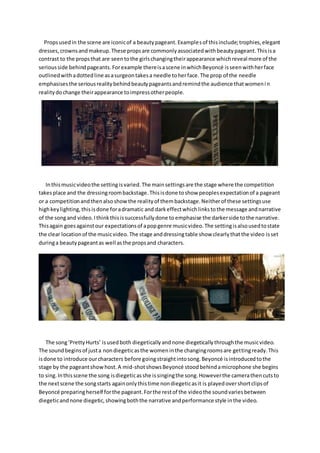 The video depicts a beauty pageant where female contestants go through pain and suffering to change their physical appearance and conform to stereotypes to impress the male judge. It shows the contestants preparing in the dressing room by applying makeup, dresses, and changing their looks unhappily. Throughout the video, Beyoncé contrasts the contestants' initial and final appearances through cuts between her singing with trophies and eventually destroying them, representing how the pageant forces her to pretend to be someone she's not. The video uses props, settings, and sound mixing associated with pageants and performances to emphasize the darker realities behind changing one's looks to please others in such competitions.