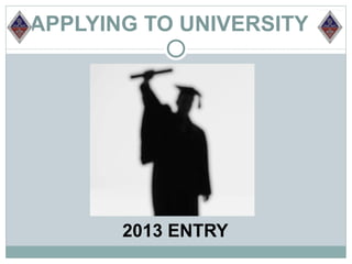 The document discusses the increasing competition for university places in the UK. It notes that university applications and required grades have risen while funding and places have decreased. This means admissions tutors will be more selective and popular subjects will be even more competitive. It provides advice for students on researching options, applying early, securing work experience, and securing funding.