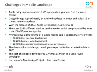 The document discusses the challenges of mobile app development, highlighting the frequency of updates from Apple and Google, the diversity of devices, and the average development timeline. It outlines the various stages of the application development process, including requirement analysis, mockup design, UI design, development, testing, and publishing. Additionally, it touches on the costs associated with hiring mobile developers compared to web developers, and the expected saturation of the mobile app developer market by 2020.