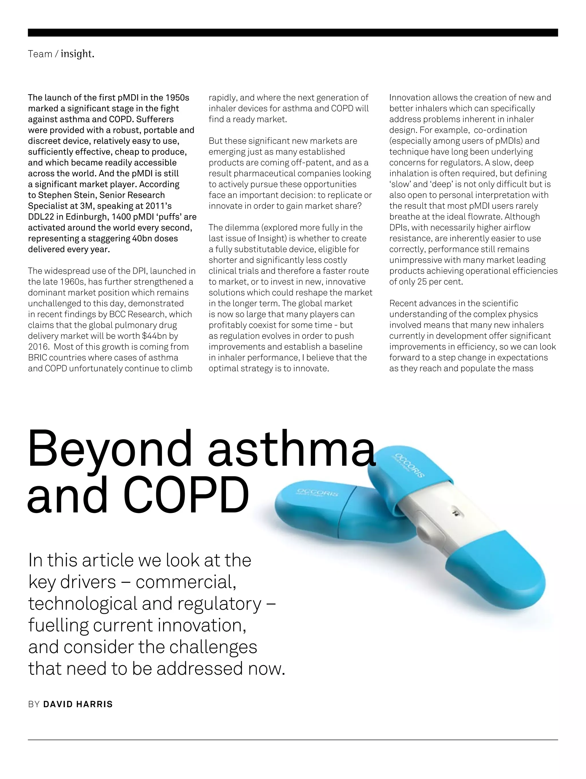 The document discusses key drivers fueling innovation in inhaler devices. It notes that while pMDIs and DPIs have significantly helped asthma and COPD patients, new markets are emerging for other therapies like pain relief and vaccines. This is putting pressure on companies to innovate beyond replicating existing devices. Next-generation inhalers are being developed with much higher efficiency than current leading products. Additionally, inhalers need to accommodate new dosing regimes and individual user needs to expand into delivering a wider range of drugs. Regulatory standards are also expected to increase as the technology advances.