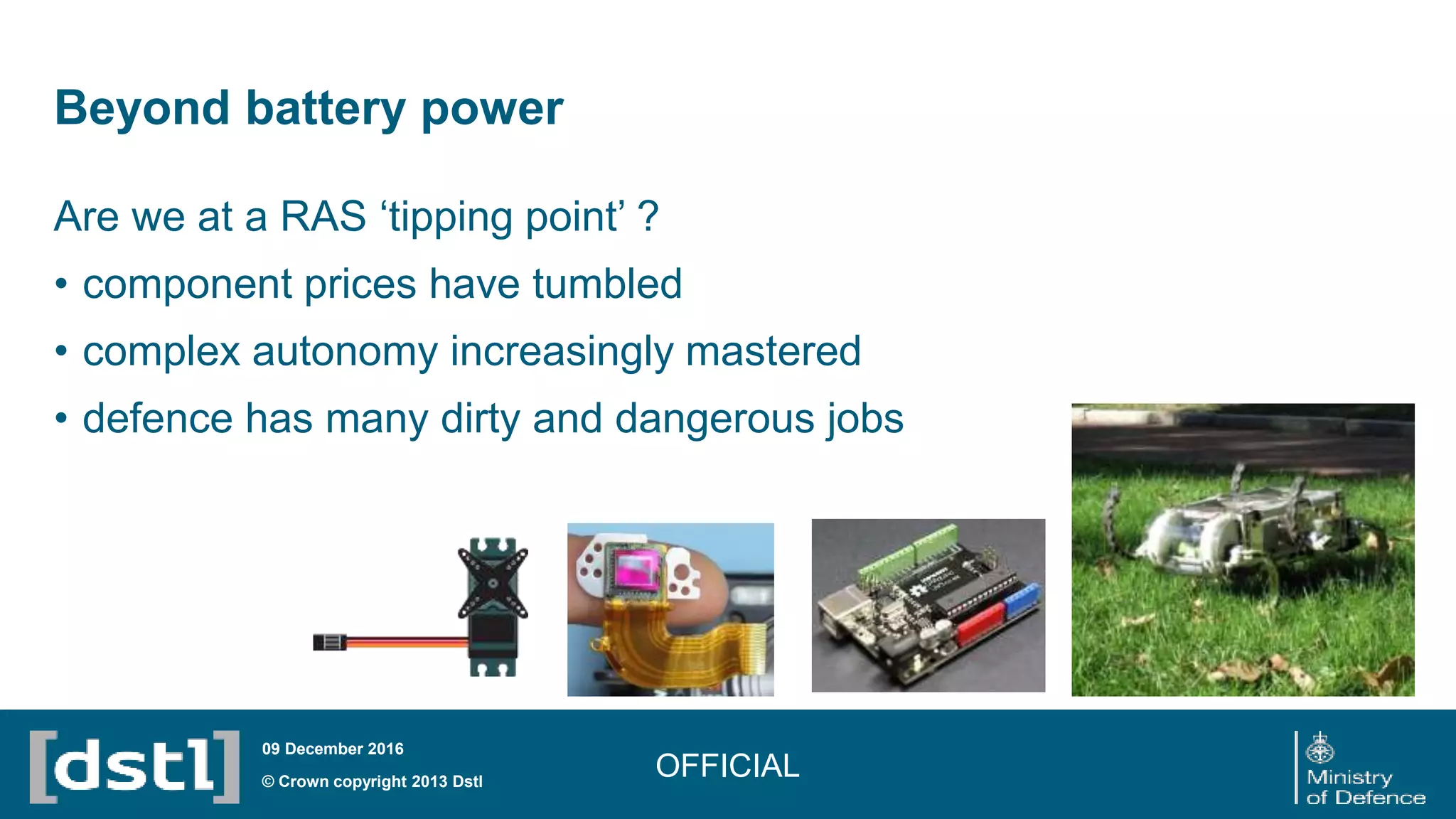 The document discusses the limitations of battery power for small autonomous robots and soldiers. While smaller robots are safer and more practical for defense applications, current battery technology only allows for an hour or two of operation, which is not enough. Batteries are also limited in their energy density and unlikely to improve much in the next 10-20 years. The document proposes potential alternative power solutions that could be explored, such as photovoltaic energy capture from flames, novel engine/generator combinations, or single-use power sources that last a day or two before recycling. It concludes that long-endurance power sources for smaller robots present an opportunity for defense applications if technical challenges can be addressed.