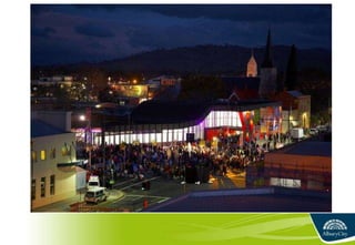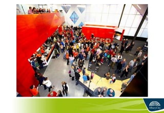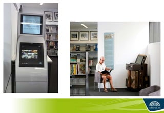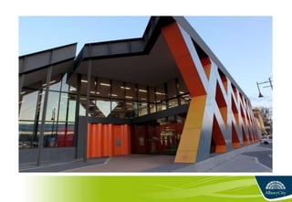 2) Key statistics showing increases in floor space, visitors, loans, and exhibitions from the separate facilities to the integrated Albury LibraryMuseum over time.