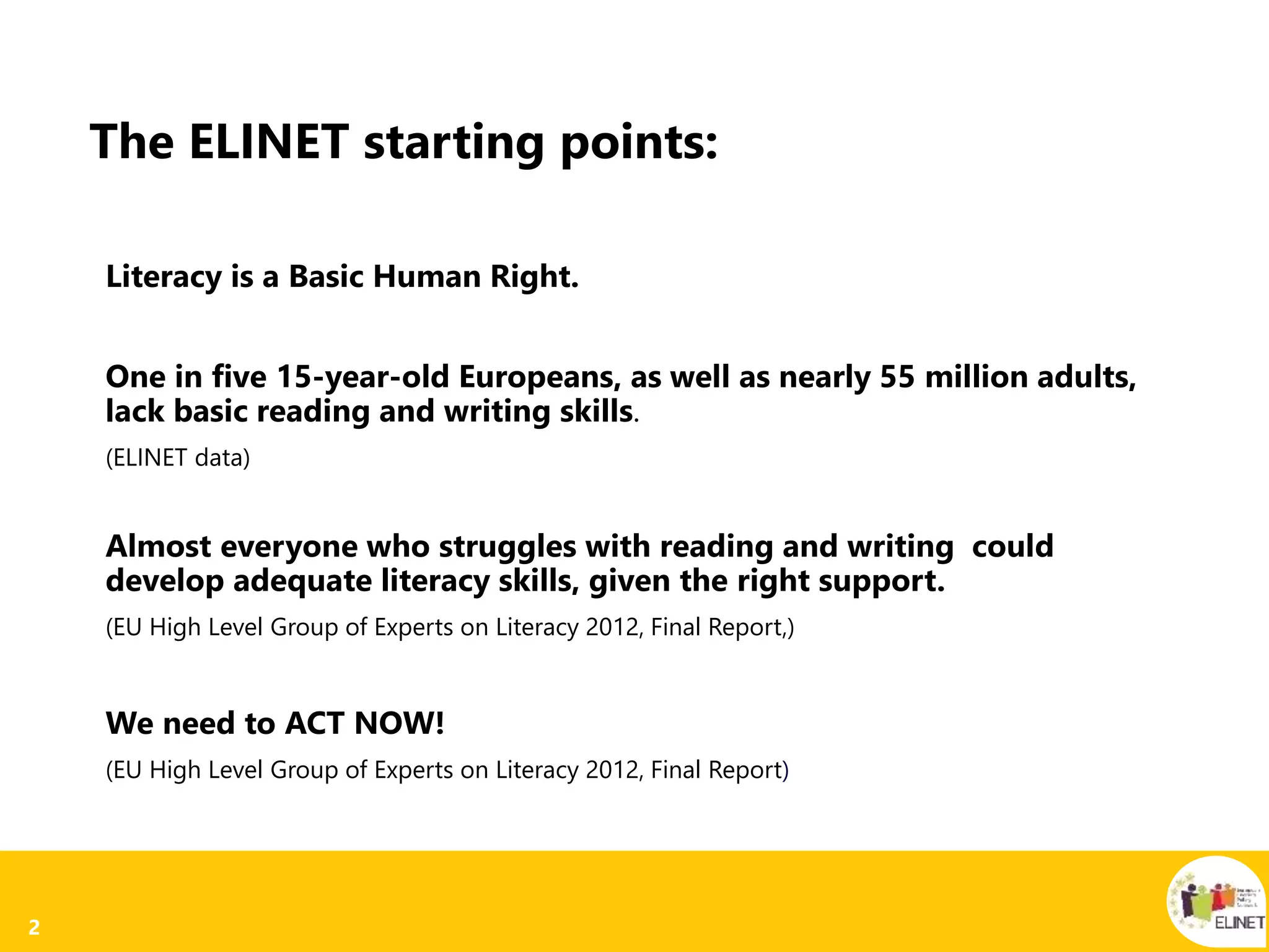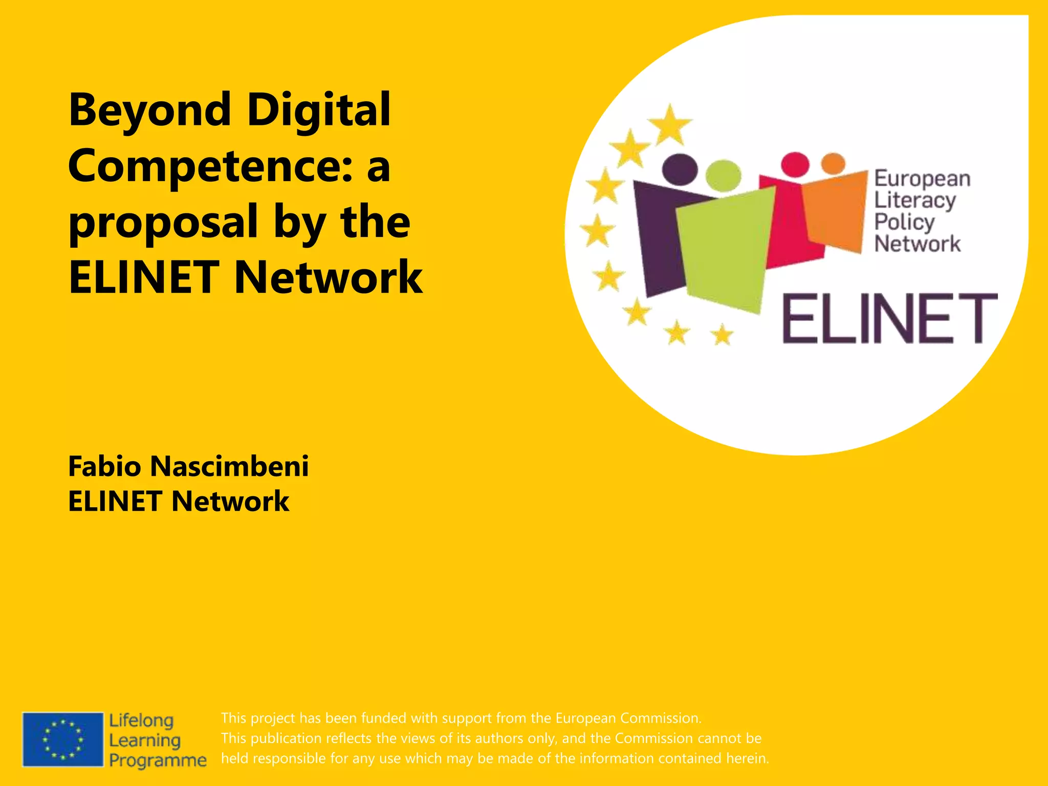 The document discusses the ELINET project, funded by the European Commission, which aims to enhance literacy across Europe, citing that one in five 15-year-olds and nearly 55 million adults lack basic literacy skills. It emphasizes the necessity of moving from digital competence to a broader understanding of digital literacy, which encompasses operational, cultural, and critical dimensions. Furthermore, it outlines challenges and opportunities in advancing digital literacy, encouraging contributions through the European Literacy Communication Platform.