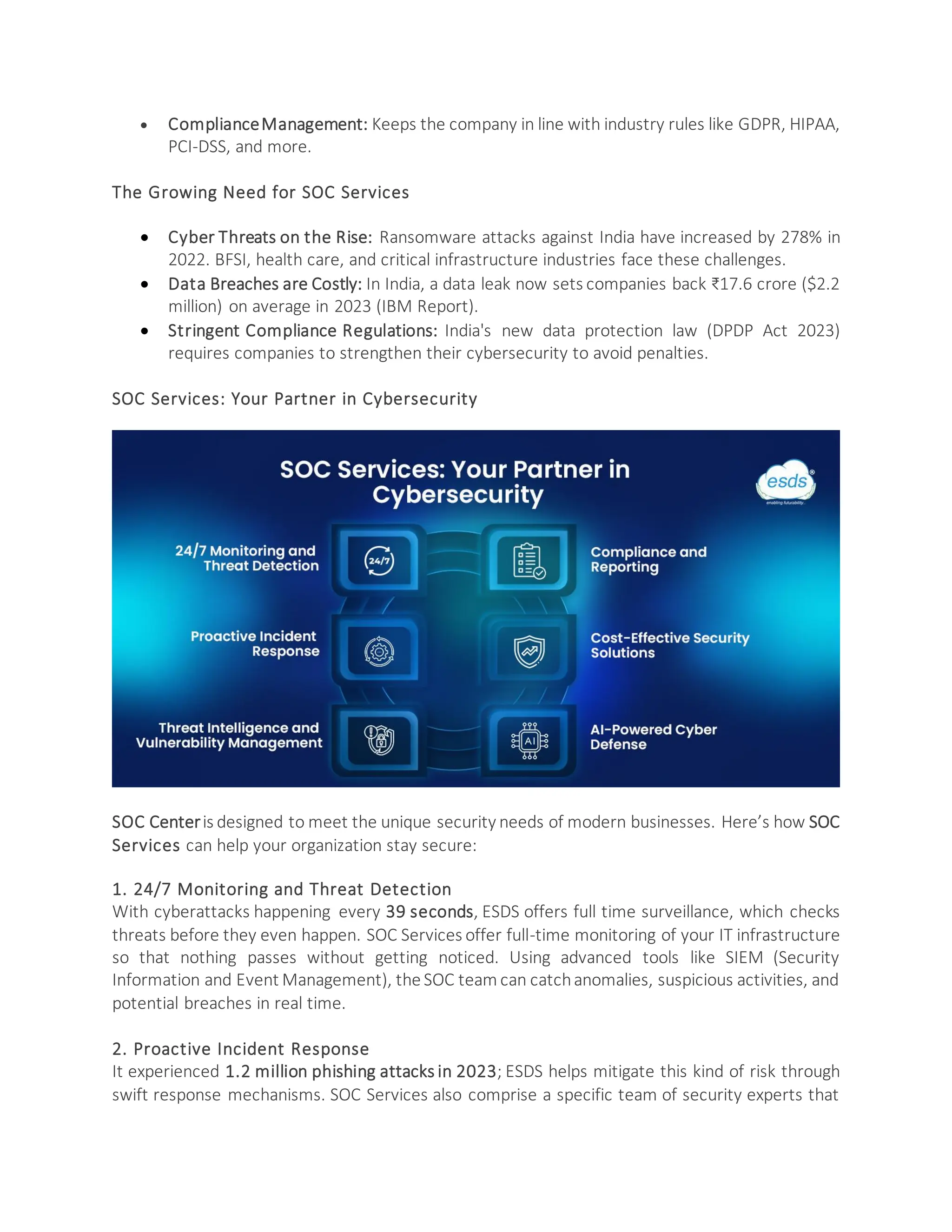 ESDS SOC Services brings tools and expertise together with support required in protecting organizations from cyberattacks and ensuring business continuity. The offerings of ESDS range from customized solutions to having SOC as a service to SOC as managed services.