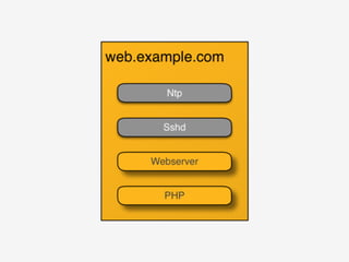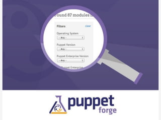 The document discusses the integration of Docker with Puppet for configuration management, detailing how to manage Docker containers and images using Puppet manifests. It provides examples of Dockerfile creation, image management, and running containers, along with basic Puppet class structures for web servers. Additionally, it mentions resources for managing container hosts and further examples on GitHub.