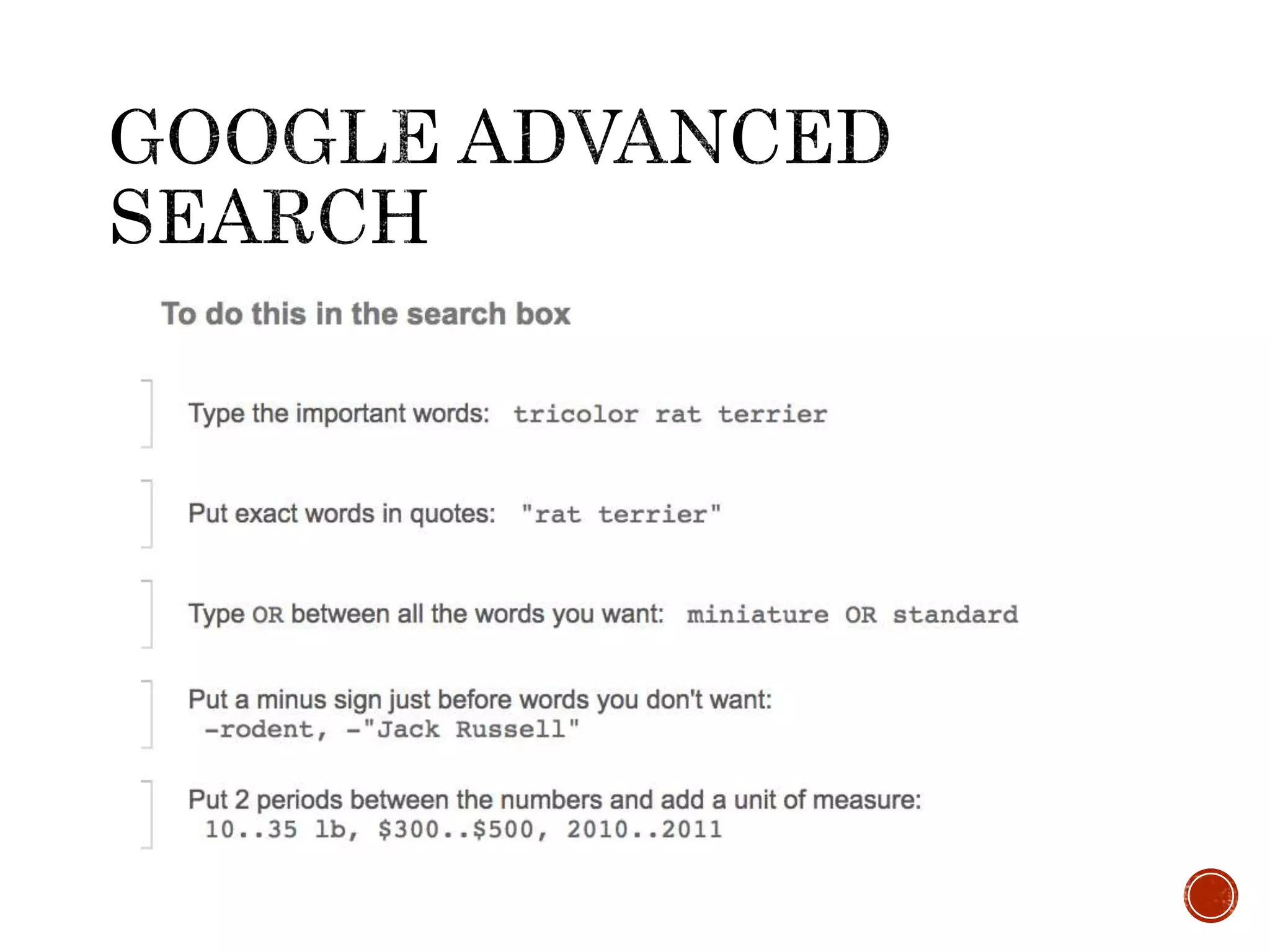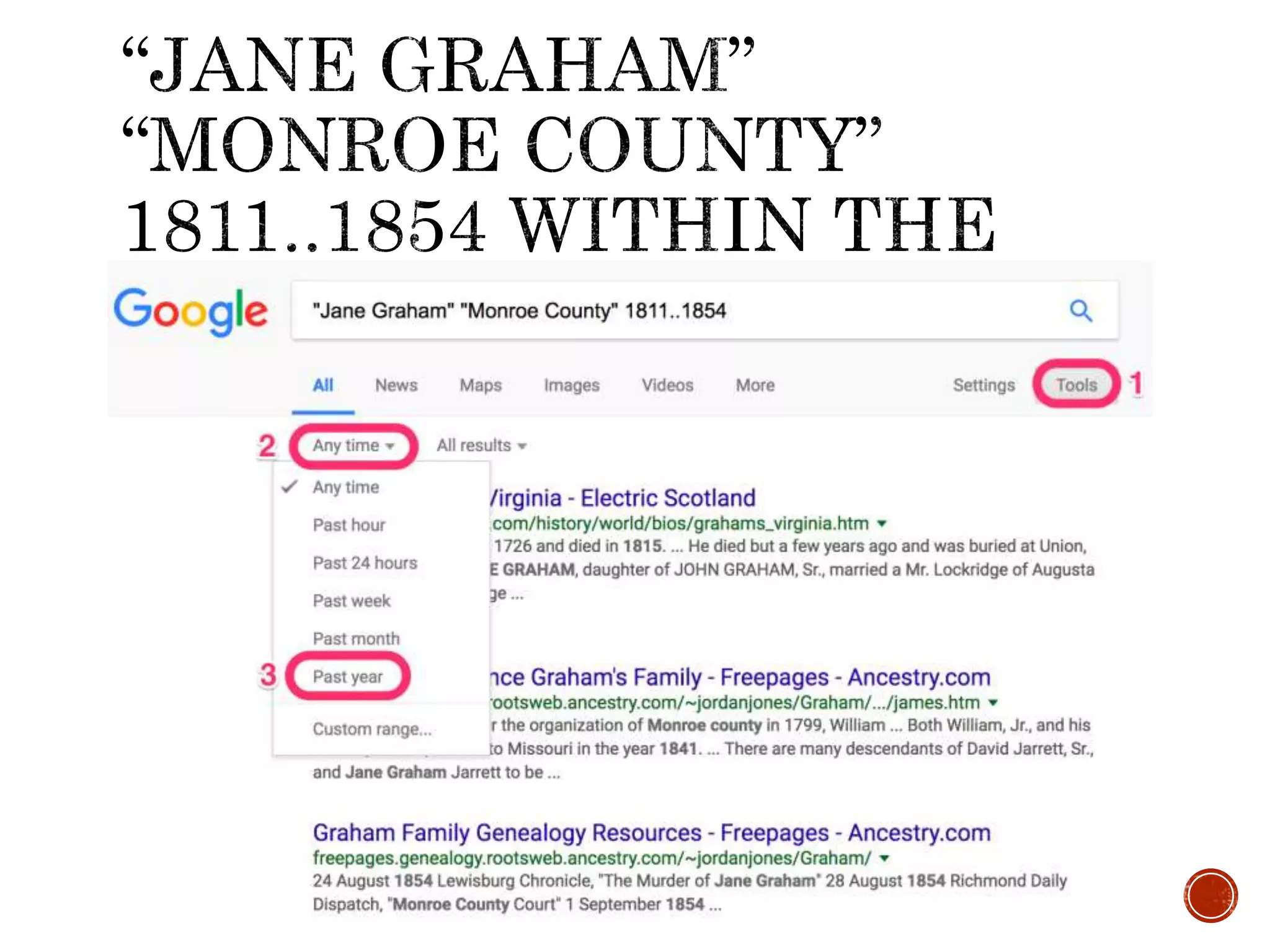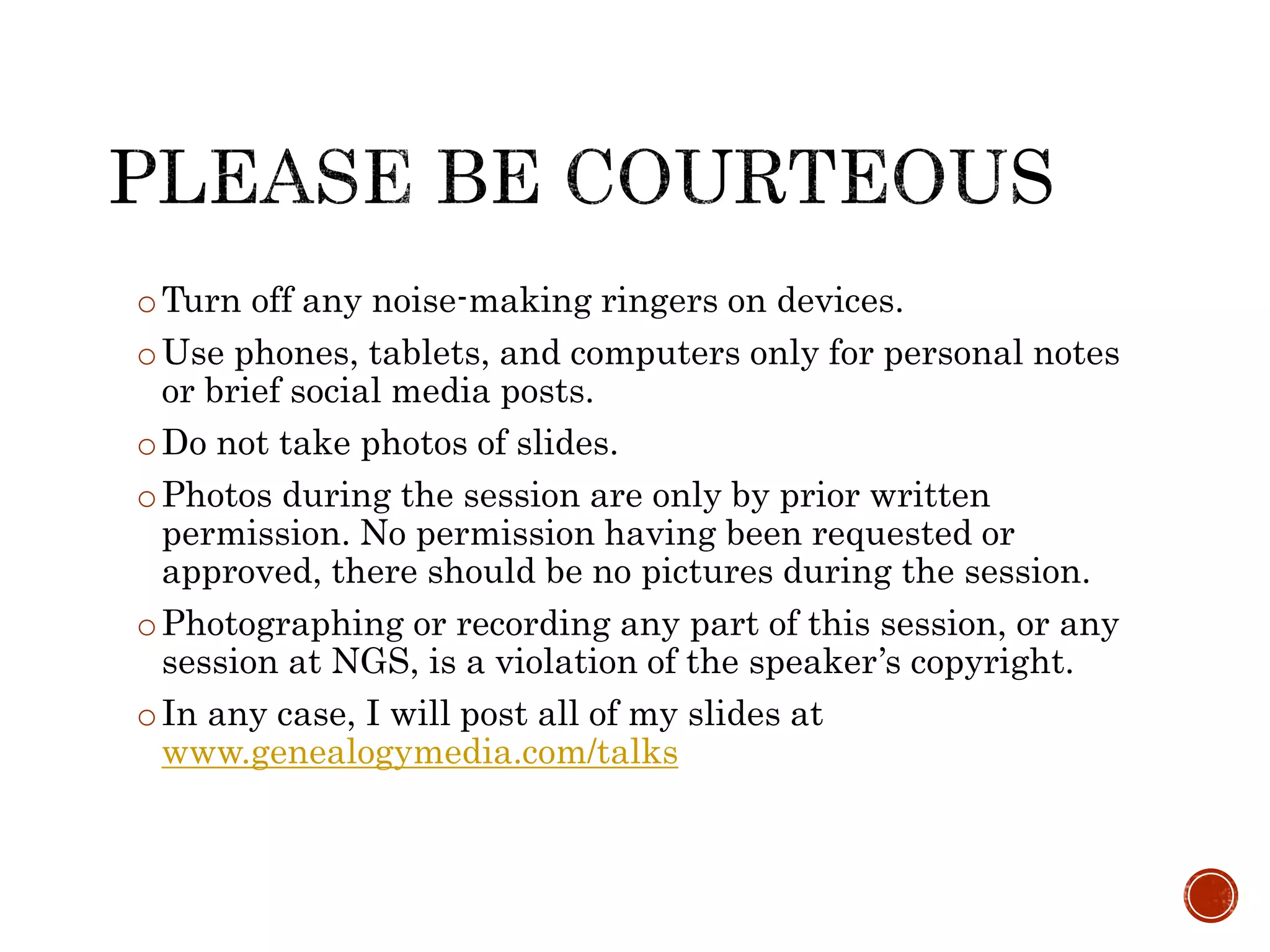 The document outlines guidelines and best practices for genealogical searching, focusing on effective use of search engines and navigation techniques. It emphasizes the importance of keyword searches, advanced search methods, and the utilization of various online tools and databases to enhance research efficiency. Additionally, it warns against unauthorized photography and recording during the session, citing copyright concerns.