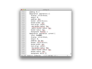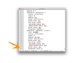 The document discusses various web development technologies and practices, including HTML5, CSS3, JavaScript, and frameworks like HAML and Jade. It covers topics like offline capabilities, multimedia support, and improved stylesheet techniques using SCSS. The content also emphasizes using modern tools and methods to enhance web design and development, alongside examples of code snippets and their functionalities.