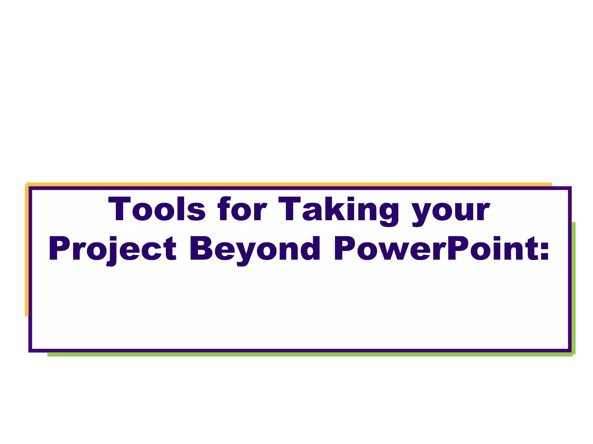The document discusses tools that can be used to take projects beyond PowerPoint, including blogs, vlogs, podcasts, screen casts, Second Life, and video conferencing. It explores collaborating tools like Skype and Oovoo, publishing platforms like websites and YouTube, and design software like Sweet Home 3D. Educators are encouraged to consider how these types of tools can be incorporated into projects for launching, collaboration, or final products. Reflection is requested on tools that could be used, challenges of enabling access, and next steps for adoption.