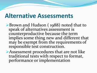 The document discusses alternative assessments in education, emphasizing their need for authenticity, meaningful tasks, and the involvement of teachers in scoring. It highlights various methods such as portfolios, journals, conferences, and self-assessments, which focus on student performance and development rather than traditional testing formats. Additionally, it outlines the objectives and benefits of these alternative assessments while noting some limitations in implementation across different cultures.