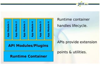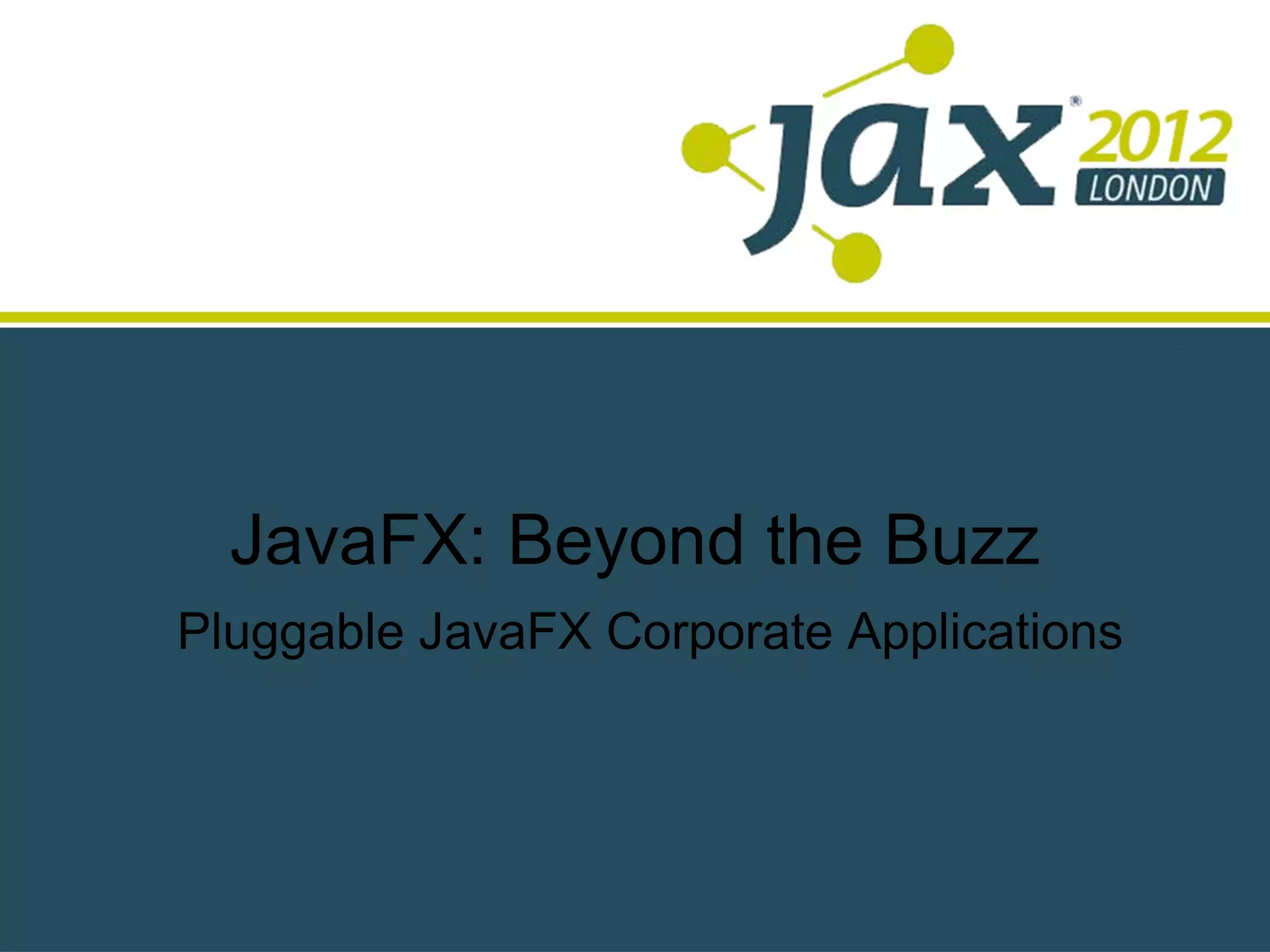 The document discusses the relevance of JavaFX in corporate applications, highlighting its user experience comparable to Adobe Flash and Microsoft Silverlight. It emphasizes the features of JavaFX within the NetBeans platform, focusing on its modular capabilities and integration with existing technologies while addressing the expectations set by modern mobile applications. Additionally, it provides insights into JavaFX's limitations as a UI toolkit and outlines resources for learning and development related to NetBeans and JavaFX.