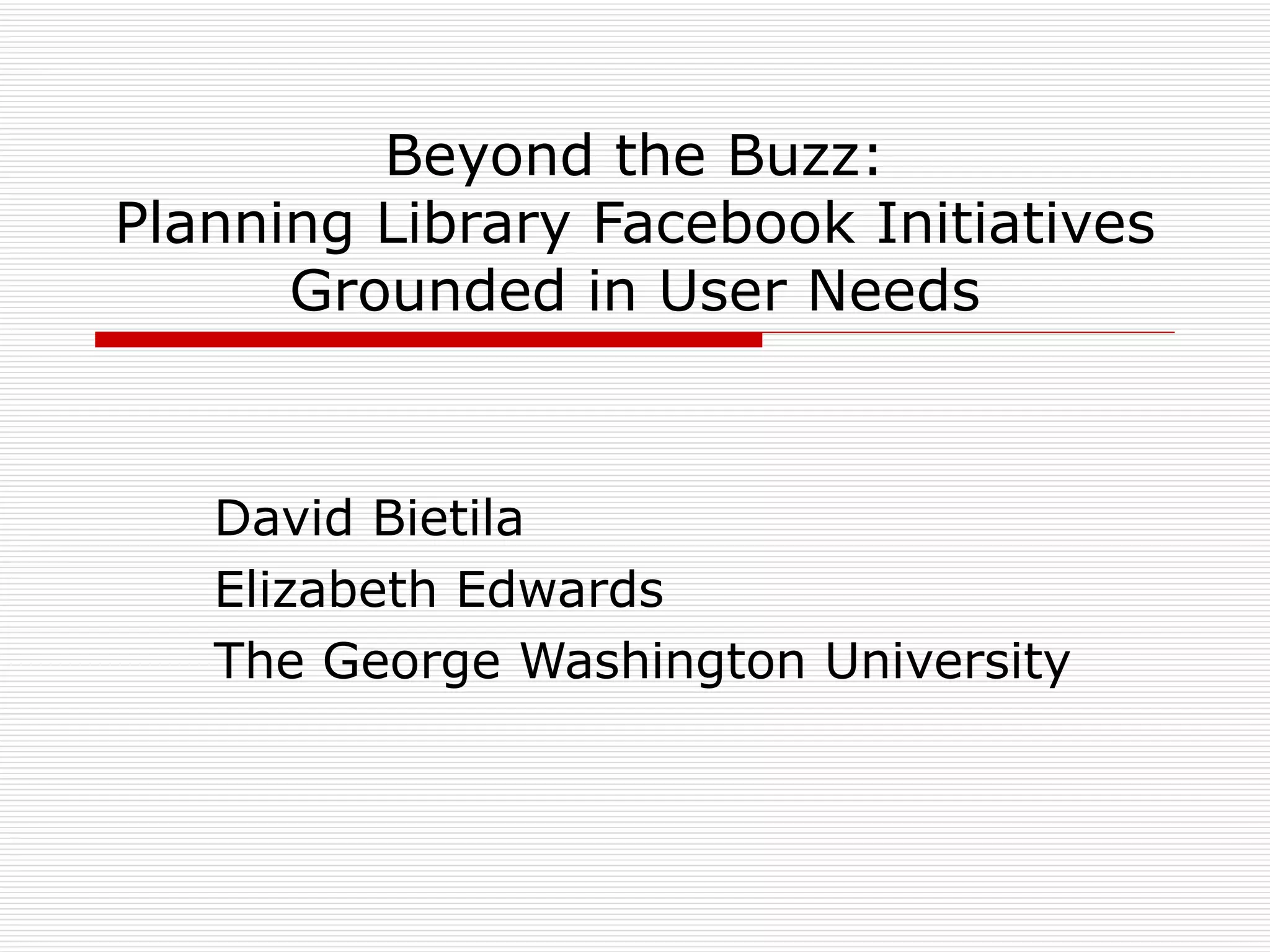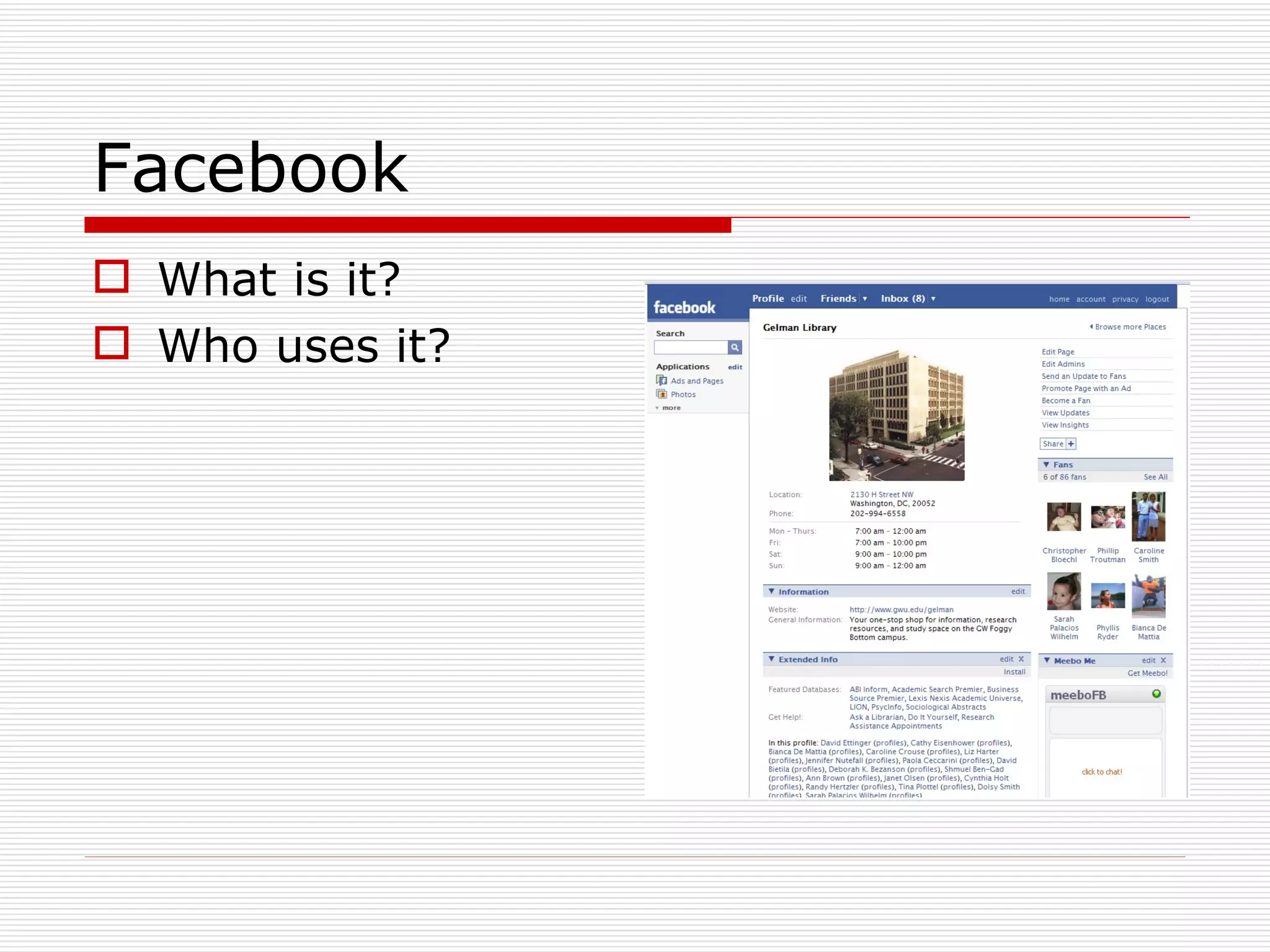 The document discusses the integration of Facebook initiatives in libraries, focusing on understanding student needs and behaviors. It explores how technology, specifically Facebook, influences students' study habits and their comfort level with librarian interactions on the platform. The findings and recommendations emphasize the importance of recognizing student perceptions and real-world interactions when developing a virtual library presence.