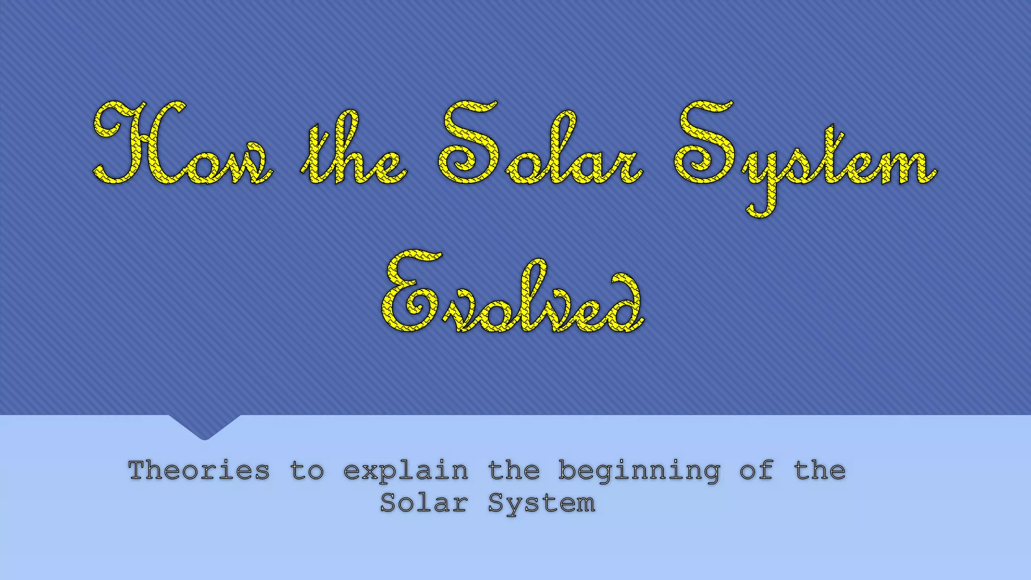 The document discusses theories about the formation of the solar system. It describes the universal law of gravitation proposed by Isaac Newton which explains how gravity keeps the planets in orbit around the sun. It also discusses the planetisimal theory proposed in 1778, which states that the solar system formed from materials thrown off after a collision between the sun and another star. Additionally, it summarizes the companion star theory that the sun once had a companion star that exploded, and the nebular hypothesis from 1776 proposing that the solar system originated from a vast swirling nebula that condensed to form the sun and planets.
