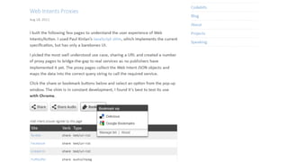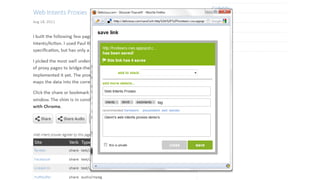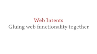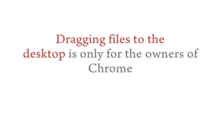 The document discusses various aspects of HTML5 drag and drop functionality, including passing data between applications and reading files dropped onto web pages. It covers techniques for managing file downloads and using web intents for sharing data like vCards. Additionally, it highlights creative independence and data ownership issues in the digital realm.