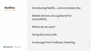 The document discusses accessibility features that are built into iOS mobile operating systems. It describes features like zoom, dynamic text size adjustment, high contrast mode, switch control for devices other than touchscreens, and built-in voice commands. It emphasizes that delivering good accessibility requires a team effort across many roles including design, development, and quality assurance. Developers need to add accessibility metadata to user interfaces to support features like screen readers.