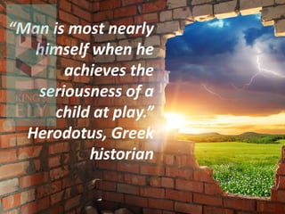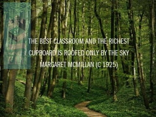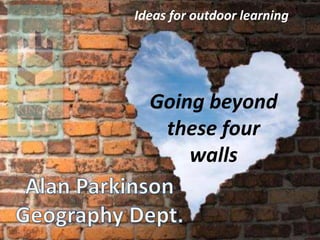This document discusses the benefits of outdoor learning and provides ideas for activities that can be done outside. It notes that fieldwork can positively impact long-term memory and social skills development. Outdoor activities mentioned include cloud spotting, shape hunting, writing poetry, and capturing sounds. The document emphasizes using curriculum artefacts from the outdoors, like stones or maps, in meaningful ways back in the classroom with subject knowledge and planning. Teachers are challenged to select an outdoor activity, add a subject context, and create a curriculum artefact to share ideas for taking learning beyond four walls.