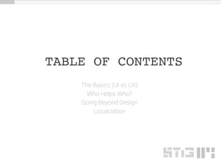 The document discusses the distinction between User Interface (UI) and User Experience (UX), exploring their definitions, limitations, and the cultural factors that influence design. It emphasizes the importance of conceptualizing user experience before UI design, illustrating this with examples and case studies. Additionally, it touches on the impact of technology on usability and suggests areas for improvement in sectors like banking and advertising.