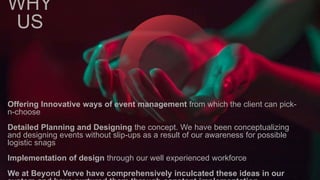 Beyond Verve provides event management and brand activation services. For over 10 years, they have planned and executed various events including conferences, product launches, exhibitions, road shows, and more across India and globally. They have expertise in conceptualizing creative concepts and handling all aspects of event planning, production, and implementation. Beyond Verve works with clients across various industries and has extensive experience in conducting successful events and activations.