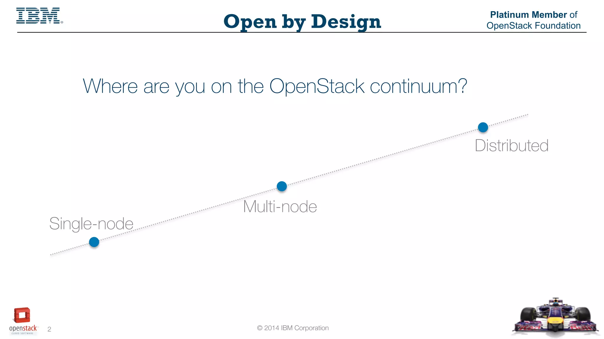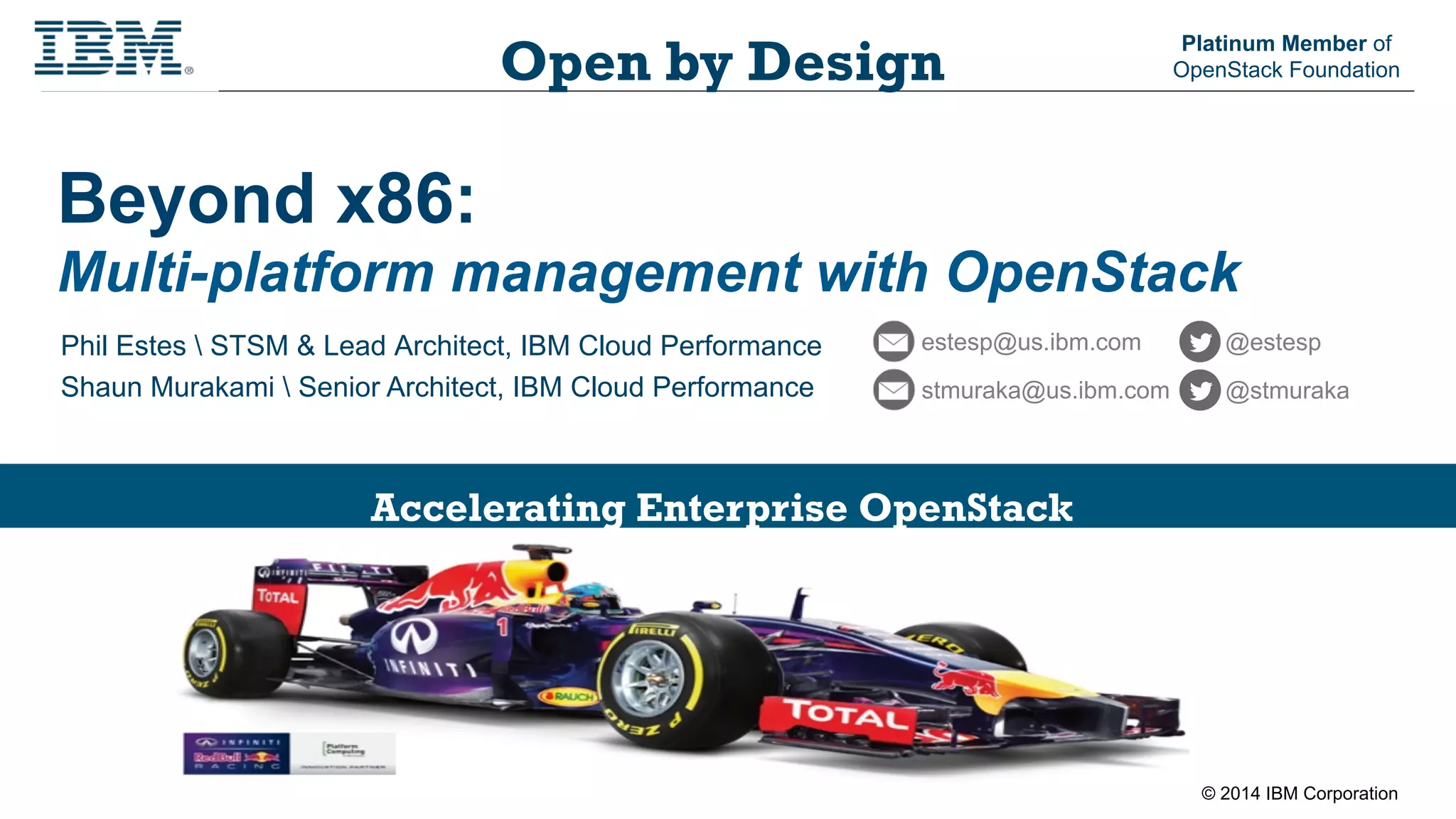 The document discusses the integration of multi-platform management with OpenStack, focusing on different deployment architectures, including single-node, multi-node, and distributed systems. It highlights the need for other platform architectures beyond commodity x86 hardware due to customer requirements, mentioning IBM System Z, Power Systems, and ARM microservers. Additionally, it outlines the benefits of co-locating workloads, consolidation strategies for reducing complexity, and details on IBM's OpenStack offerings and sessions at an event.