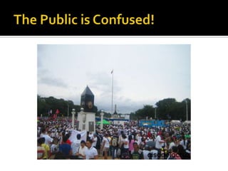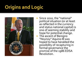 Since 2010, the Philippine political landscape has shown stability with hopes for change under President Aquino, highlighted by high government satisfaction ratings and legislative progress on public good bills. Despite these gains, socio-economic issues persist, including widespread poverty and contradicting government policies on economic rights and land appropriation. Challenges such as ongoing civil conflicts, economic vulnerabilities, and the monopolization of public discourse continue to inhibit true democratic and social development.
