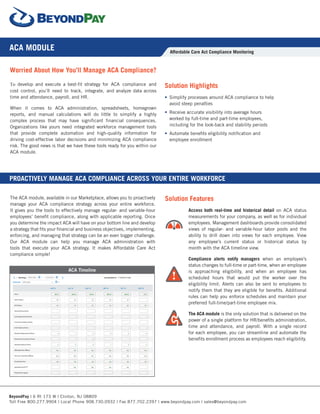 The document discusses an ACA compliance module that helps simplify ACA processes, provides visibility into employee hours and eligibility, and automates benefits enrollment. It allows management of regular and variable employees for compliance and reporting. The module provides tools to execute an organization's ACA strategy through integrated workforce data from time and attendance, payroll, and HR systems. Alerts notify of status changes and approaching eligibility. The single system streamlines benefits administration as employees reach eligibility.