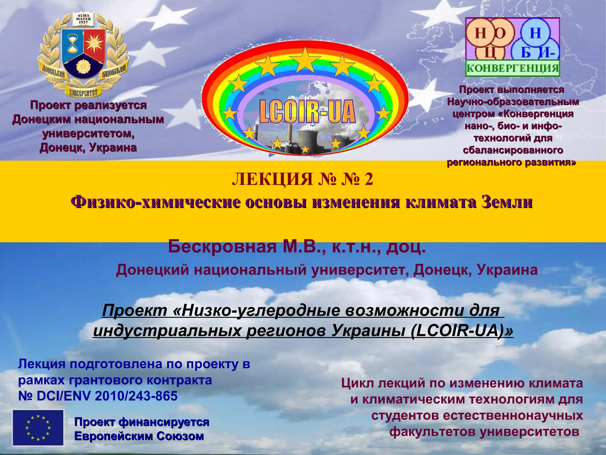Документ представляет лекцию, посвященную физико-химическим основам изменения климата Земли, в рамках проекта, финансируемого Европейским Союзом и реализуемого Донецким национальным университетом. В нем обсуждаются причины глобального потепления и влияние антропогенного выброса углекислого газа на климат, с акцентом на различные мнения ученых касательно его воздействия. Указывается, что увеличение концентрации углекислого газа может иметь положительное влияние на сельское хозяйство и прирост растительности.
