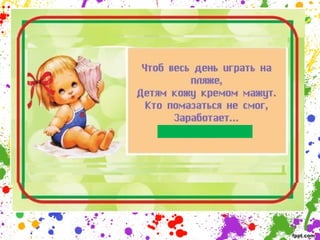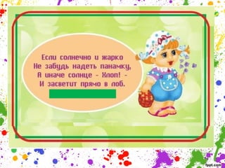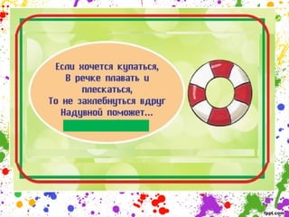 Документ представляет собой руководство по безопасному поведению детей летом, представленное в виде картинок и стихов-загадок. Он подчеркивает важность соблюдения правил во время летних развлечений, таких как плавание и сбор ягод. Материал создан для детей и подготовлен библиотекой гимназии в Новополоцке.