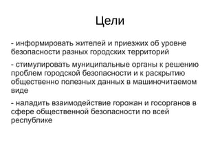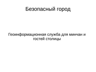 Документ описывает проект создания геоинформационной службы для мониторинга уровня безопасности в Минске, направленной на информирование жителей, чиновников и туристов. Основная цель проекта заключается в создании сетевого приложения на основе оперативных данных МВД и МЧС для оценки криминогенной ситуации и безопасности. Также рассматривается вопрос стандартизации раскрытия общественно полезных данных органами власти.