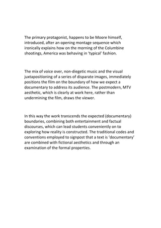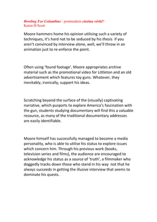 The document analyzes Michael Moore's film Bowling for Columbine, describing how it uses postmodern techniques like animation, archival footage, and provocative interviews to reinforce Moore's thesis about America's gun culture in an engaging way. It discusses how Moore personalizes the issues, using his own experiences, in a cinéma vérité style to encourage empathy from audiences. It also notes how Moore juxtaposes interviews with people like a weapons manufacturer spokesperson and Charlton Heston to bolster his arguments through irony and extremist views. Some critics argue Moore's very subjective methods can undermine his message by feeling manipulative.