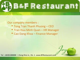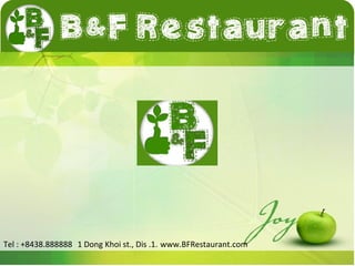 Best & Fresh Restaurant aims to be a leader in healthy, delicious, and environmentally-friendly dining around the world. It guarantees to use only the finest ingredients in its recipes and educate customers about nutritious dishes. The restaurant chooses the highest quality, freshest foods and organic vegetables from its closed farms. It maintains clean premises and provides fair-priced, well-prepared meals to customers of all backgrounds, especially teenagers. The strategic plan is to improve staff skills through training, motivate employees, expand the business network, and raise funds to invest capital and cut costs.