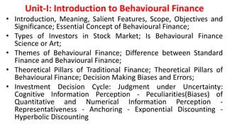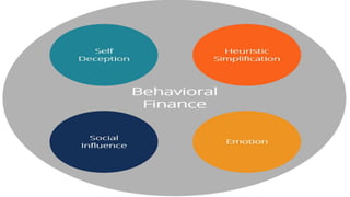 This document provides an introduction to behavioral finance. It defines behavioral finance as the study of how psychology impacts investors' financial decision making and markets. Key topics covered include common biases that influence investors like overconfidence, loss aversion, and herding behavior. Strategies for overcoming behavioral biases in decision making are also discussed, such as focusing on the decision making process rather than outcomes and pre-committing to investment plans.