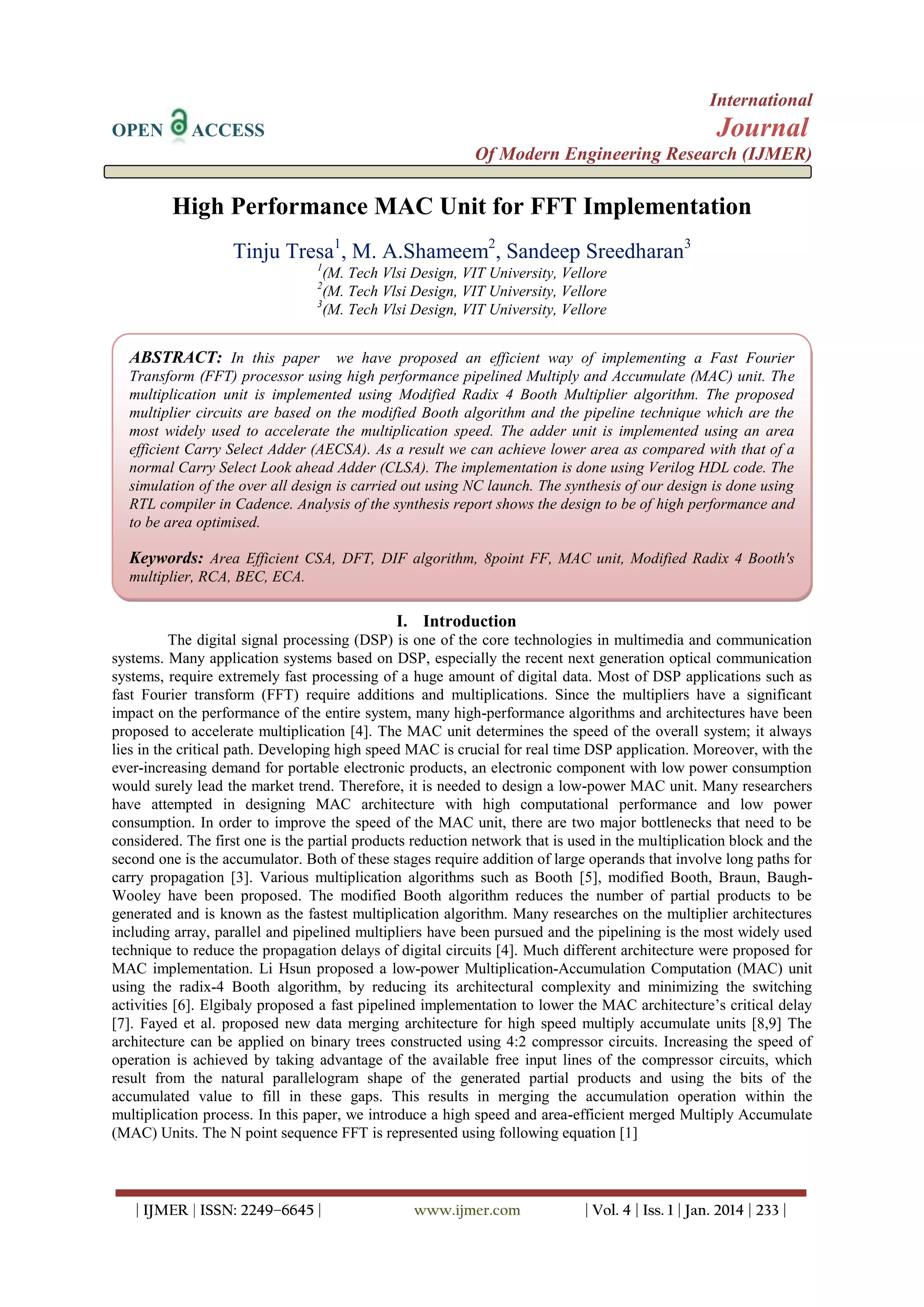 This paper presents a high-performance FFT processor that incorporates an optimized multiply-accumulate (MAC) unit using a modified radix-4 booth multiplier algorithm and an area-efficient carry select adder. The design focuses on reducing both area and power consumption while maintaining speed, thus addressing the challenges faced in digital signal processing applications. The synthesis results demonstrate enhanced performance and area optimization compared to conventional adder architectures.