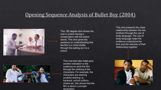 This document analyzes and summarizes techniques used in several film opening sequences to engage audiences and set tones. It discusses shots that establish settings, convey relationships, and provide clues about characters and their personalities through clothing. Editing techniques like black and white cinematography and typography are described as adding mystery and suspense. Analyzing these openings helped the author understand techniques that could be applied to their own work.