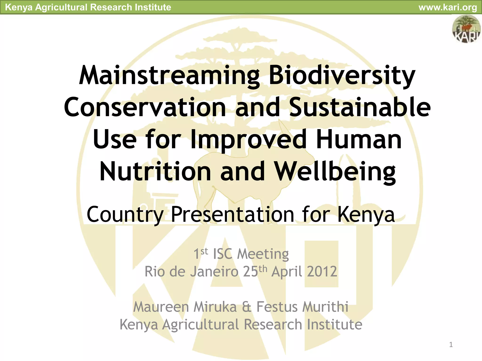 The Kenya Agricultural Research Institute (KARI) focuses on promoting biodiversity conservation and dietary diversification to combat food insecurity and malnutrition in Kenya. The initiative targets local agrobiodiversity, aiming to improve nutrition through indigenous food sources, while also developing policies and capacity-building strategies. Collaborating with various stakeholders, KARI seeks to enhance community awareness, market access, and the integration of gender analyses in agricultural practices.