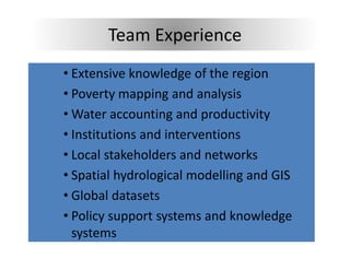 This document summarizes the BFP-ANDES project. It is led by Mark Mulligan of KCL and coordinated by Jorge Rubiano of UNAL. The project aims to use the best available science to inform land and water policy formulation and testing in the Andes to improve livelihoods. It has 6 work packages focused on poverty, water availability, production, institutions, interventions, and knowledge. The project will produce maps, databases, summaries and a policy support system to help stakeholders assess impacts of policy interventions on poverty, food production, and the environment.
