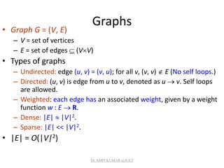 Elementary Graph Algorithms discusses graphs and common graph algorithms. It defines graphs as G = (V, E) with vertices V and edges E. It describes the breadth-first search (BFS) and depth-first search (DFS) algorithms. BFS expands the frontier between discovered and undiscovered vertices uniformly across the breadth of the frontier. It uses a queue and runs in O(V+E) time. DFS explores edges out of the most recently discovered vertex, searching as deep as possible first before backtracking. It uses timestamps and runs in O(V+E) time. Pseudocode and examples are provided for both algorithms.