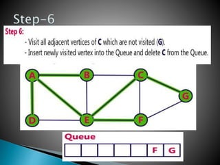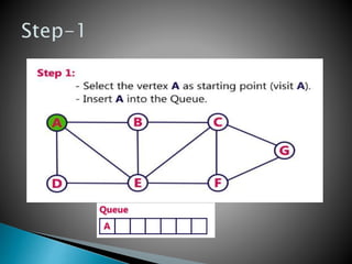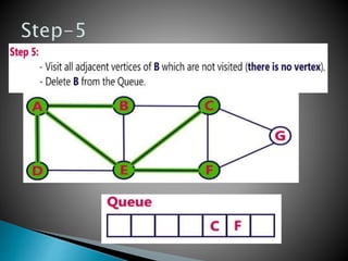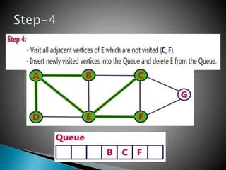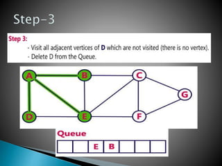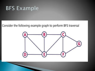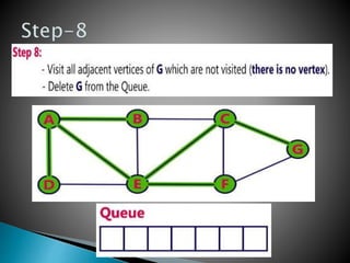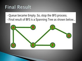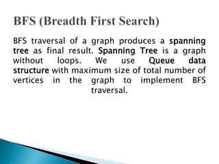 BFS uses a queue to perform a traversal of a graph, visiting all adjacent unvisited vertices of the vertex at the front of the queue and adding them to the queue. This produces a spanning tree without loops as the final result, where each vertex in the graph can be reached from the starting vertex without cycles. The queue, which has a maximum size of the total number of vertices, ensures a layer-by-layer search of the graph from the starting vertex out is performed.