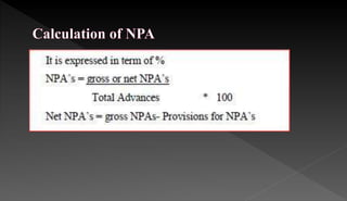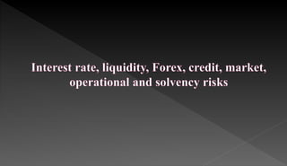 This document provides an overview of credit monitoring and risk management in banks. It discusses the need for credit monitoring to ensure funds are used as intended and loan terms are followed. It describes methods to monitor borrowers' financial status. It also explains models to predict financial distress and the rehabilitation process. The document outlines different types of risks faced by banks including interest rate, liquidity, foreign exchange, credit, market, operational, and solvency risks. It discusses the risk measurement and mitigation process as well as non-performing assets and asset-liability management.