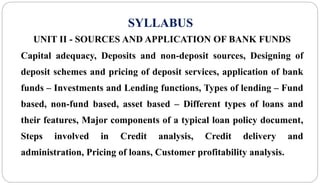 This document provides information on sources and application of bank funds, including capital adequacy, deposits, non-deposit sources, loan types, and credit analysis. It discusses capital adequacy ratios and their calculation. It describes various deposit types including transaction deposits and term deposits. It also outlines non-deposit sources of funds such as certificates of deposit, foreign funds, and money market funds. The document discusses designing deposit schemes, pricing deposits, and applying bank funds through lending and investments. It details various loan types including fund-based, non-fund-based, and asset-based loans. It outlines the major components of a loan policy and the steps involved in credit analysis, delivery, administration, and pricing of loans. It concludes with