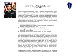 The document outlines the strategic vision and objectives of the U.S. Army, emphasizing the need for a warfighting force that is agile, responsive, and adaptable to various conflicts, including low intensity and asymmetric threats. Key goals include enhancing operational jointness, developing leaders, and integrating active and reserve components while ensuring the well-being of soldiers and their families. The roadmap involves innovative structures, modernization, and investment in personnel to maintain the Army's status as the preeminent land combat force in the world.