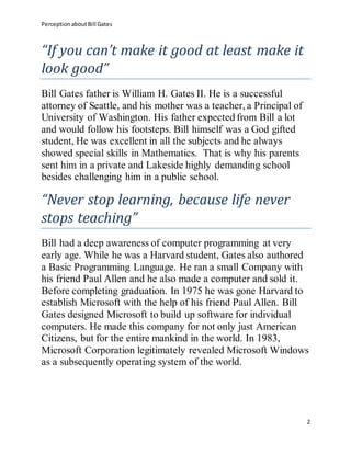 Bill Gates is the co-founder of Microsoft and one of the richest people in the world. He was born in 1955 in Washington D.C. and showed an early aptitude for computer programming. He dropped out of Harvard to start Microsoft with his friend Paul Allen. Microsoft released its first operating system in 1983 which became very successful. Gates focused on philanthropy later in life through the Bill and Melinda Gates Foundation, which has donated over $28 billion to issues like health and education globally.